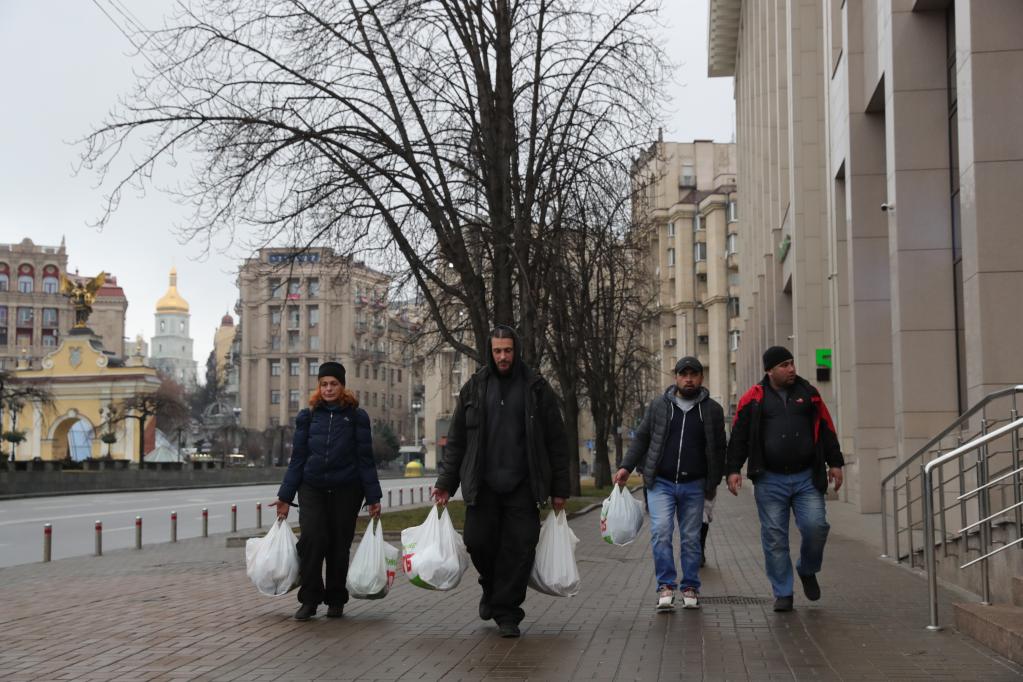 2月24日,在乌克兰基辅,当地居民拎着采购的物资走在街道上。(新华社记者李东旭摄)