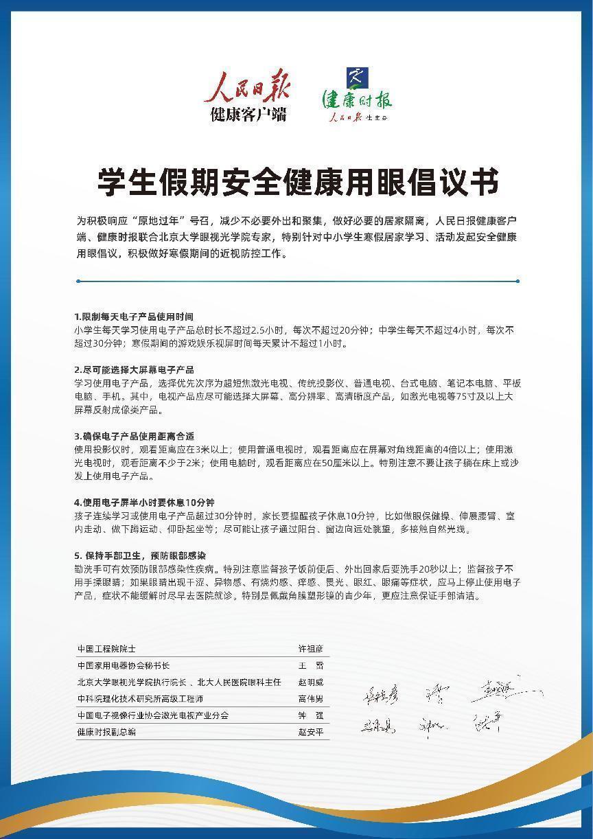 事实上,早在去年年初,就有专家就这一问题展开过专项讨论,并提出了中肯建议。2021年1 月 23 日,由人民日报健康客户端、健康时报主办,多位专家参会的“2021健康家电发展论坛暨安全护眼专家倡议发布会”,发布了《学生假期安全健康用眼倡议书》。