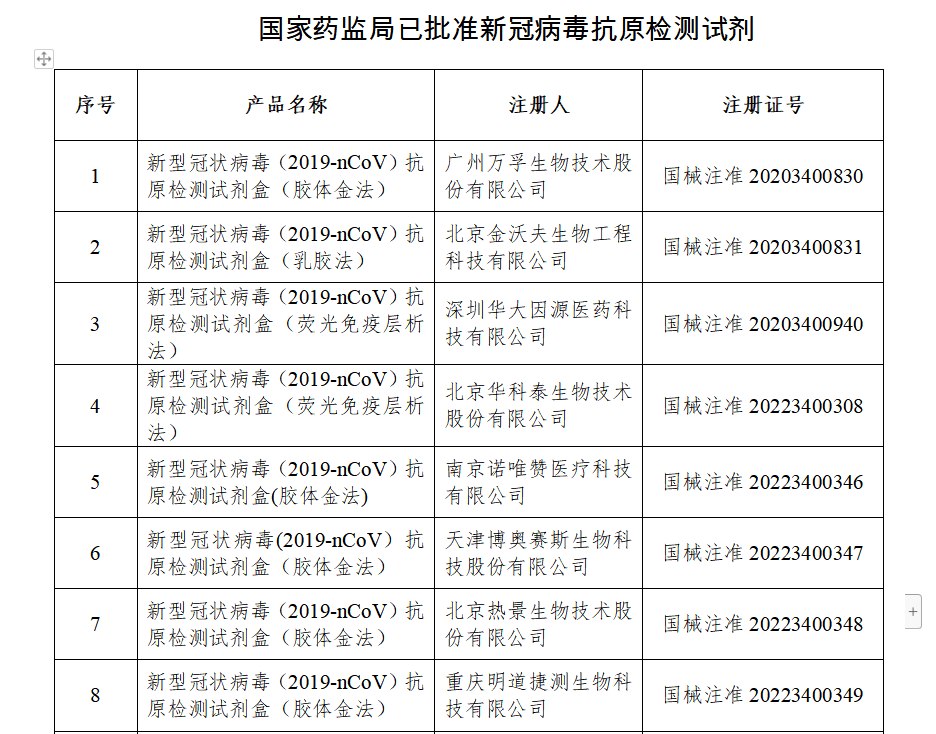 3月23日,经国家药监局审查,批准2个新冠病毒抗原检测试剂产品。截至3月23日,国家药监局已批准19个新冠病毒抗原检测试剂产品。