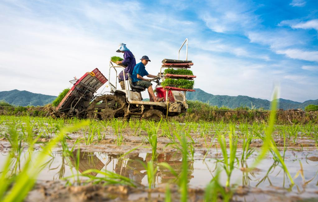 4月12日,江西省九江市都昌县蔡岭镇杨湾村农民驾驶农机在田间劳作。新华社发(傅建斌 摄)